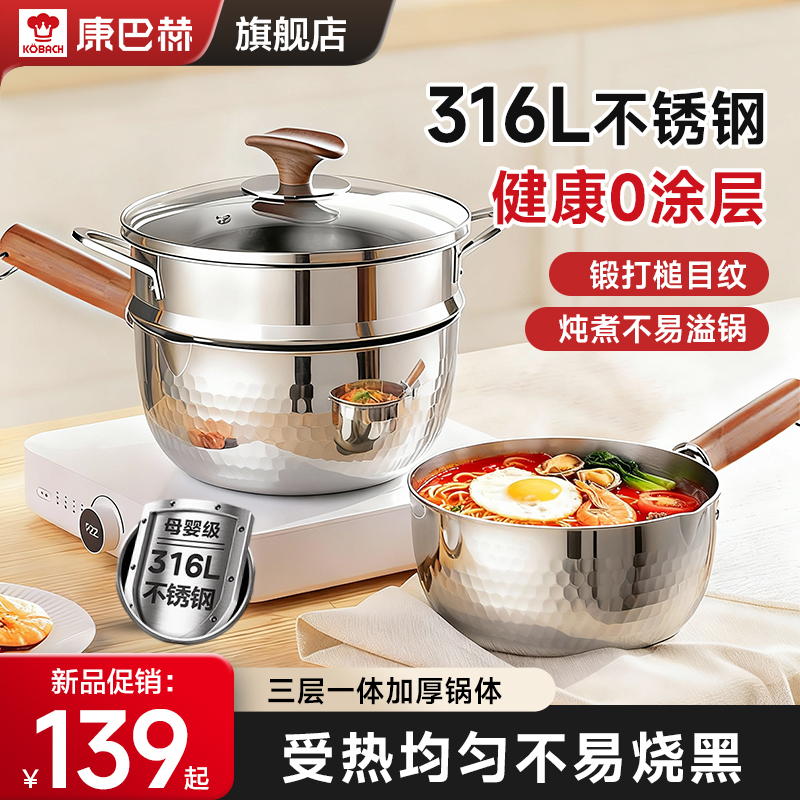 康巴赫316不锈钢奶锅宝宝婴儿辅食锅多功能蒸煮一体小汤锅泡面锅