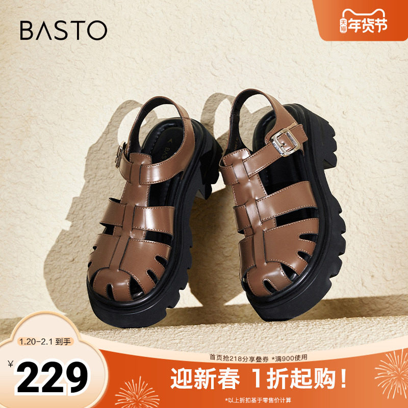 百思图春夏季新款商场同款时尚复古猪笼鞋粗跟女凉鞋E0950BH4