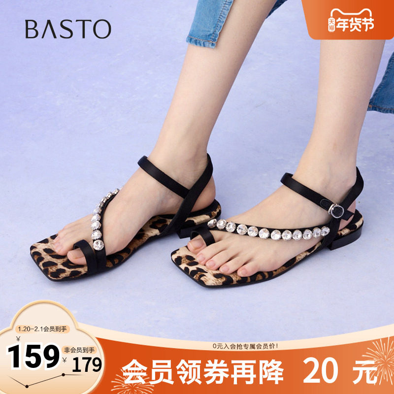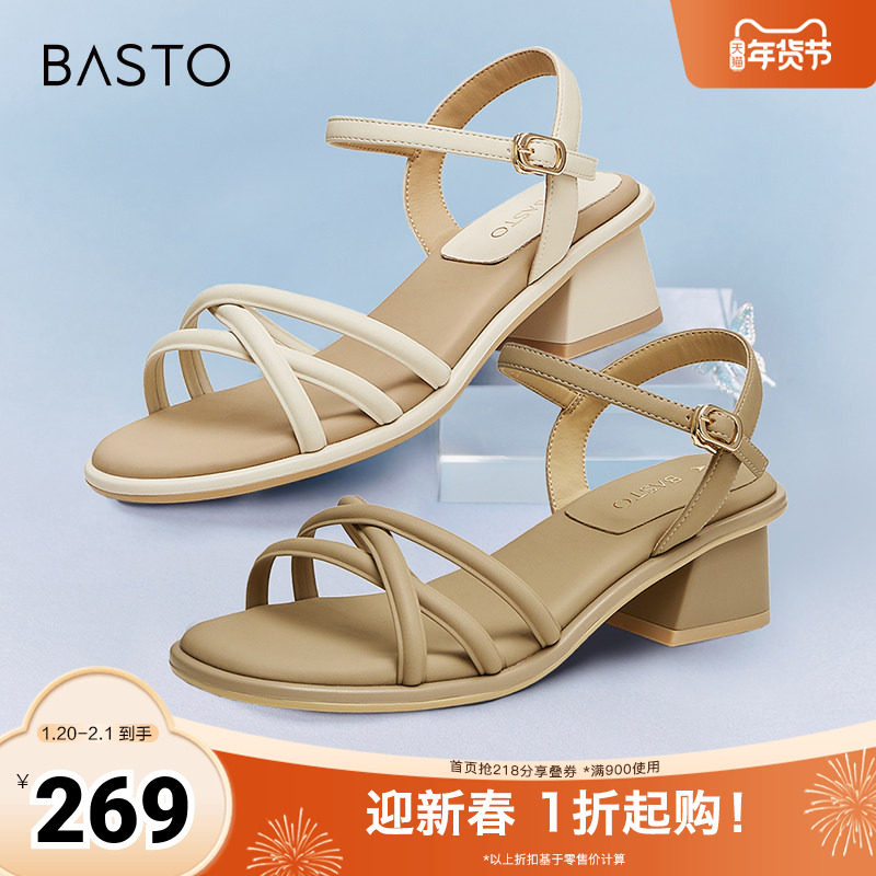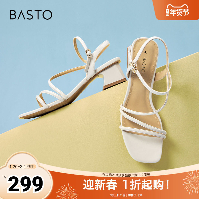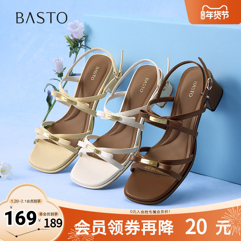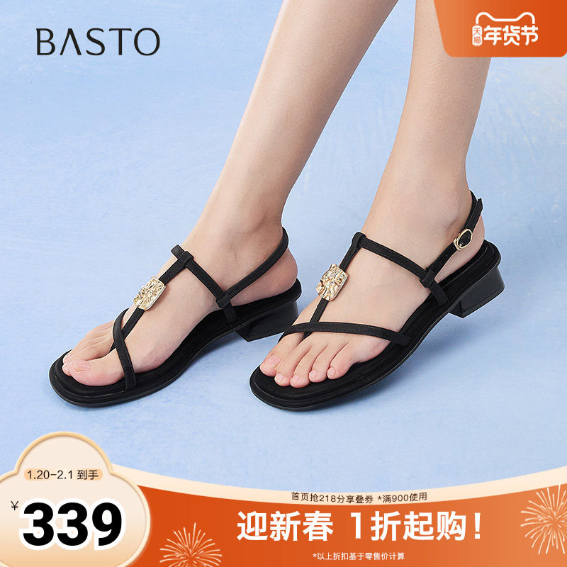 百思图春夏季新款商场同款时尚复古条带罗马粗跟女凉鞋M1033BL4
