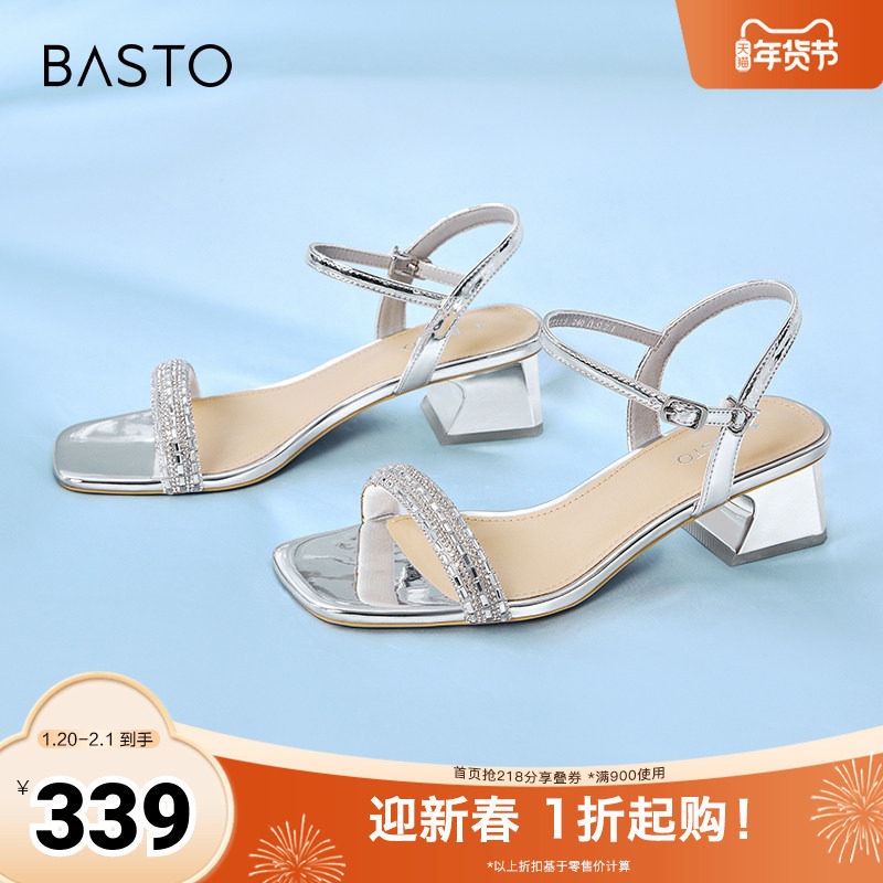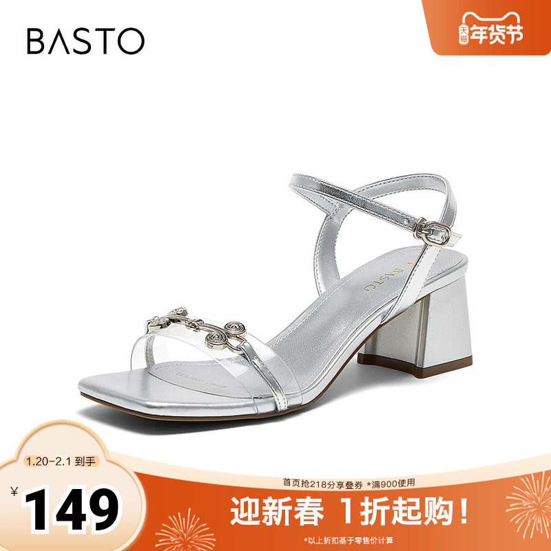 百思图春夏季新款商场同款时髦金属扣方头粗跟女凉鞋RJF51BH4