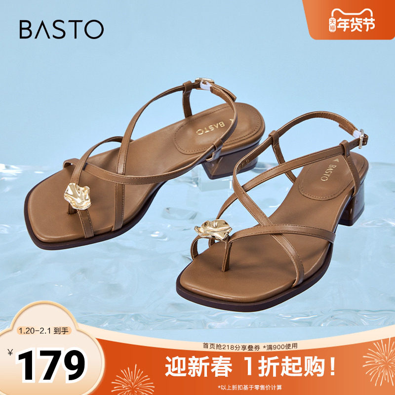 百思图2025夏季新款时尚潮流复古风罗马凉粗跟女凉鞋B5378BL5