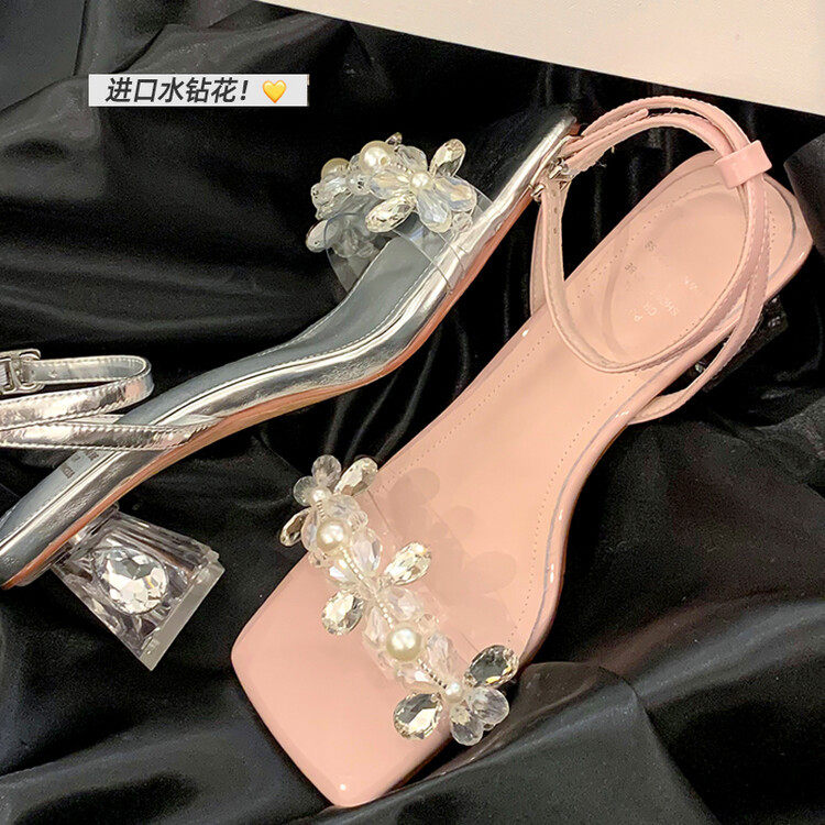 ~小仙女~2023夏季水钻花朵水晶粗跟女凉鞋露趾透明一字带中高跟鞋