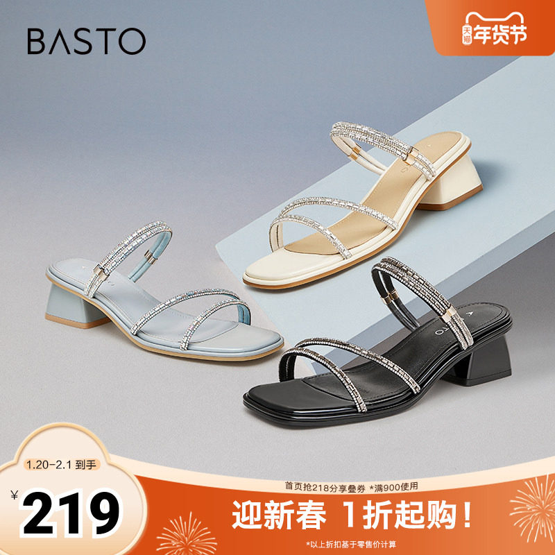 百思图2025夏季新款商场同款一字带时尚潮流粗跟女凉鞋B9501BL5