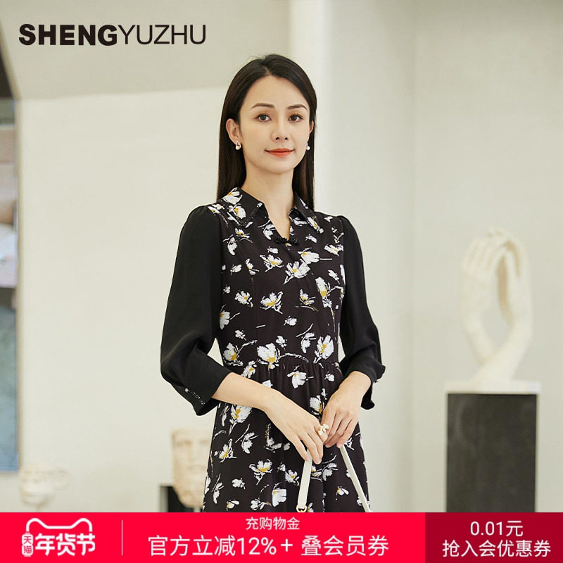 大婷婷 长裙印花方领A字裙连衣裙开叉收腰长袖秋季修身DT1552