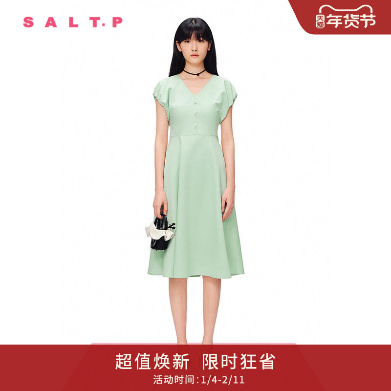 SALT.P可颜v领收腰显瘦清爽薄荷绿A字裙连衣裙2024夏