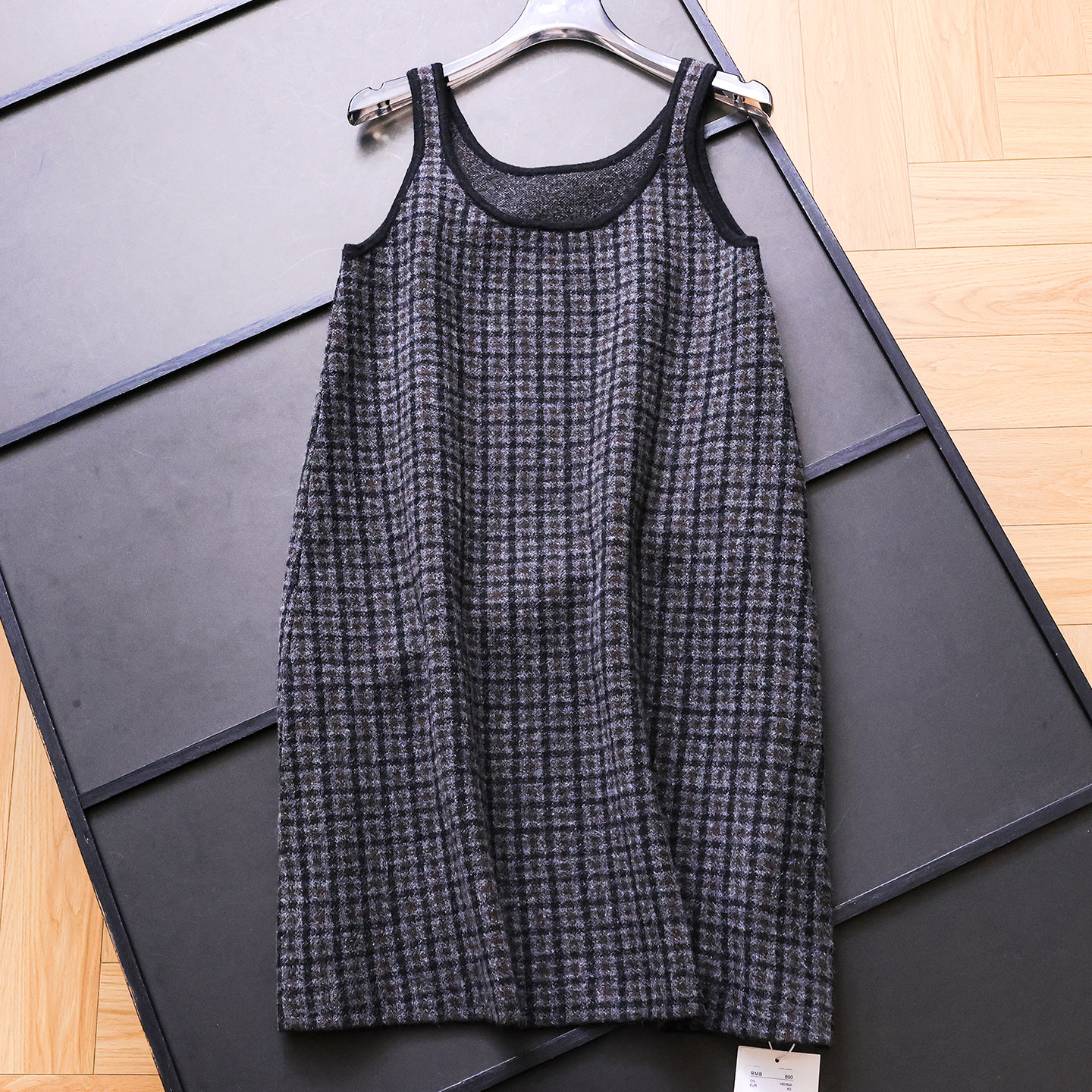 复古格纹圆领无袖叠穿背心裙针织毛衣裙宽松微a字裙连衣裙女M363