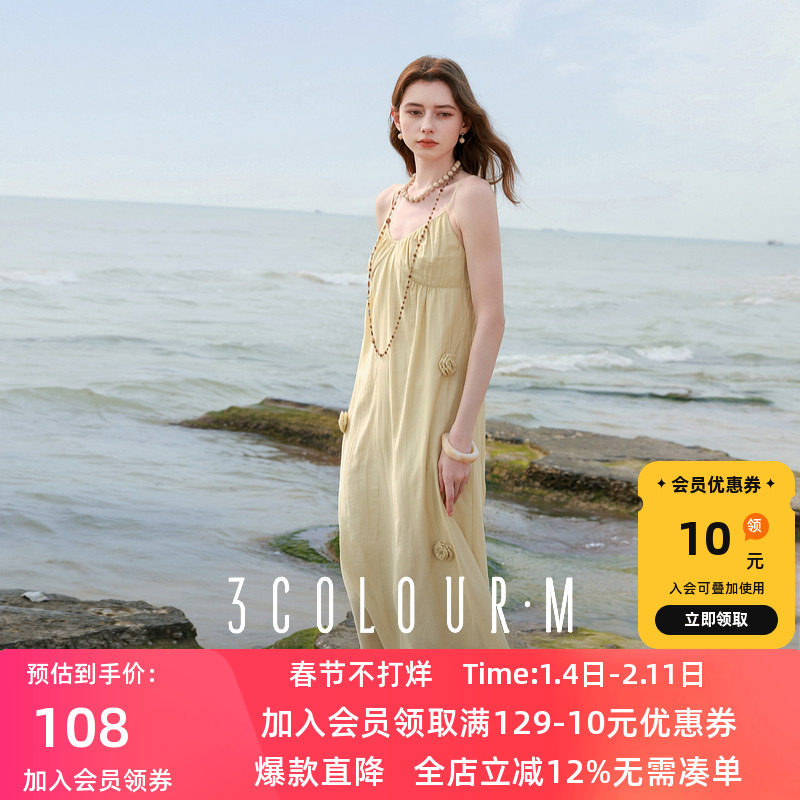 三彩2025夏季新款肌理感吊带裙立体花朵A字裙连衣裙长裙度假M