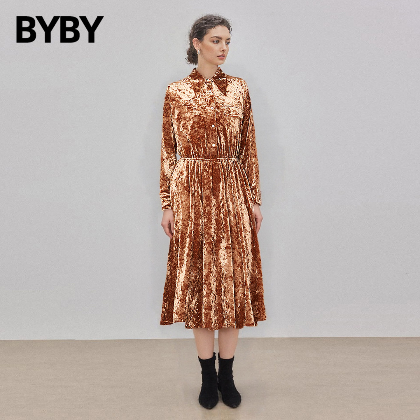XULU原创秋季美利诺慕斯绒优雅圆领长袖大摆裙收腰A字裙连衣裙