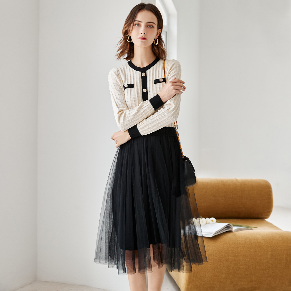 pusumede 法式气质长袖针织连衣裙女收腰显瘦a字圆领打底裙短裙子