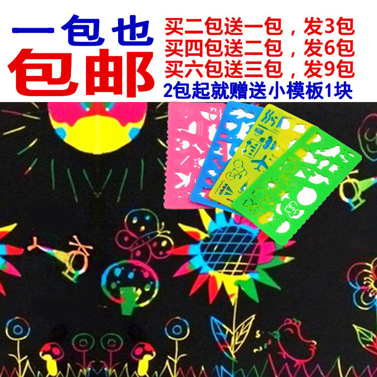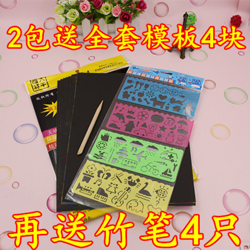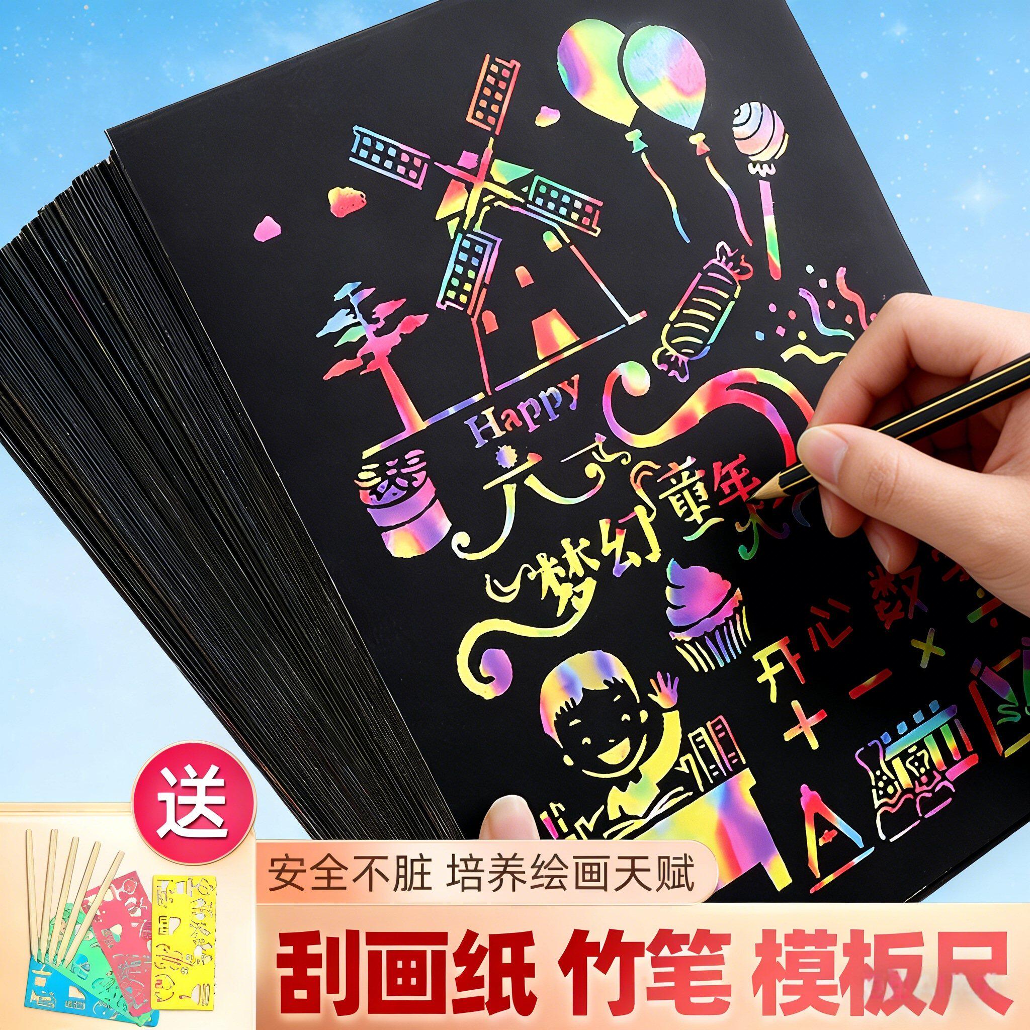 儿童炫彩刮画纸8k创意diy制作幼儿园涂鸦画纸50张送模板竹笔包邮