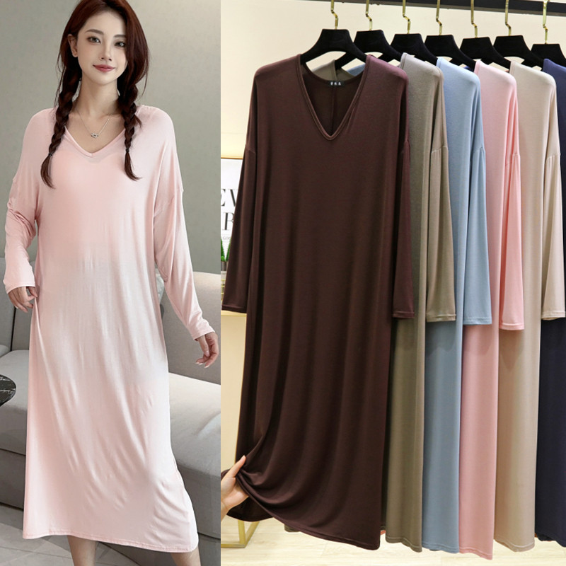 春秋薄款莫代尔长裙纯色长袖连衣裙V领女宽松睡裙居家打底裙大码
