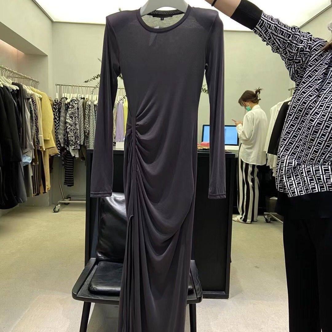 2025春夏新款褶皱开叉连衣裙女高腰显瘦气质圆领含垫肩莫代尔长裙