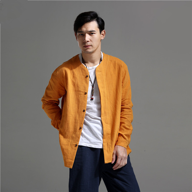 春季橘色中年男士商务长袖复古衬衫休闲开衫外套小清新棉麻上衣禅