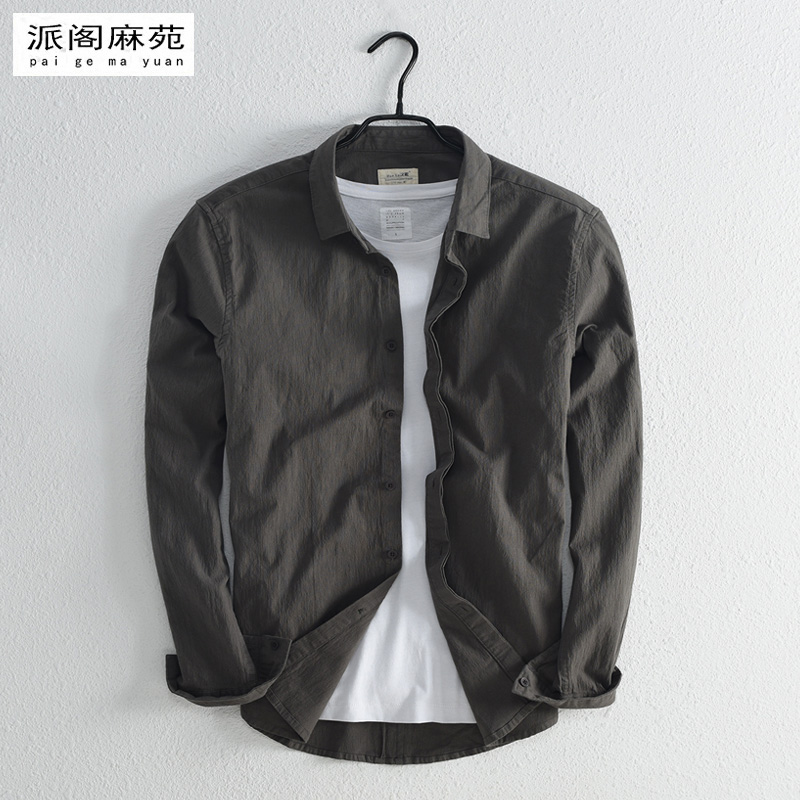 马登工装法式复古磨毛长袖古巴领薄衬衫外套那不勒斯美式衬衣男夏