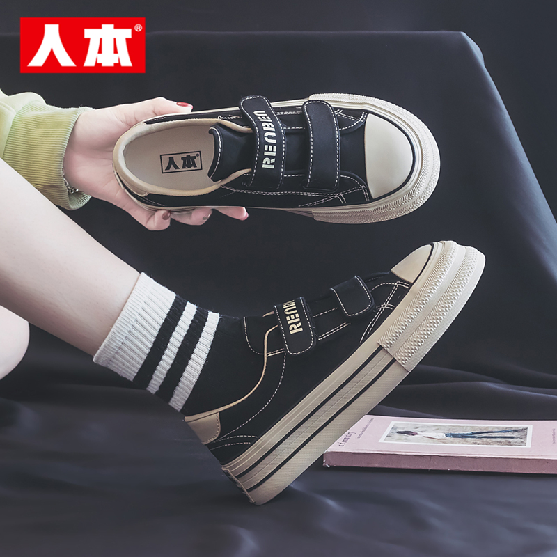 人本魔术贴帆布鞋女2025秋季新款板鞋厚底女鞋休闲学生运动鞋子潮