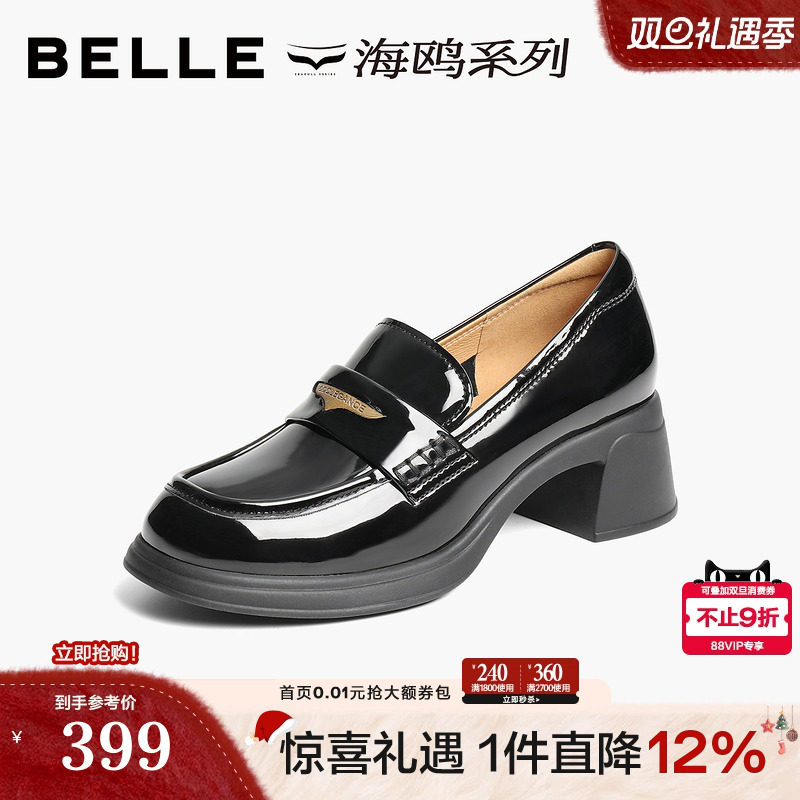 百丽女鞋子粗高跟海鸥乐福鞋黑色小皮鞋通勤上班单鞋3A6B5AA5