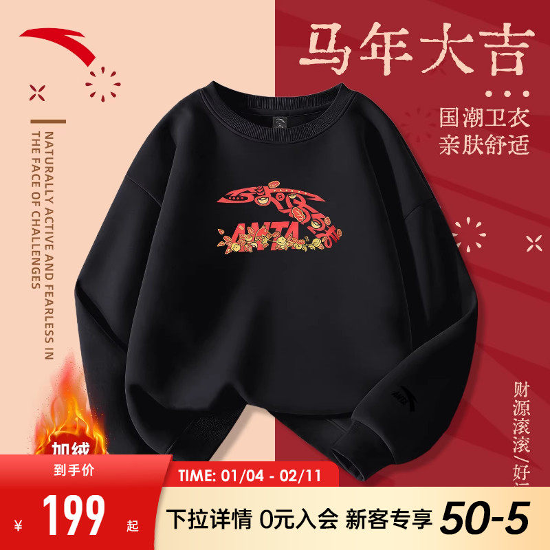 安踏卫衣男加绒保暖好事发生2026新款本命年圆领套头宽松运动外套