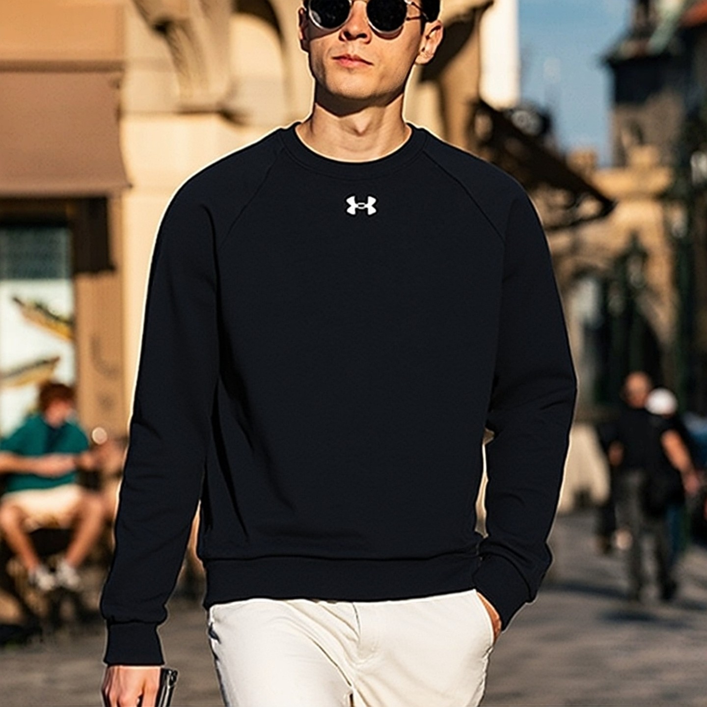 安德玛卫衣男加绒套头衫秋冬Rival抓绒圆领宽松运动卫衣黑色上衣