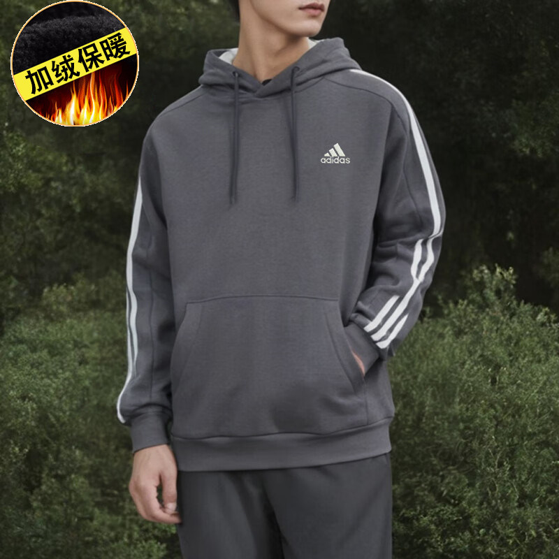 阿迪达斯灰色连帽卫衣男加绒运动服宽松外套三条纹套头衫IJ6475