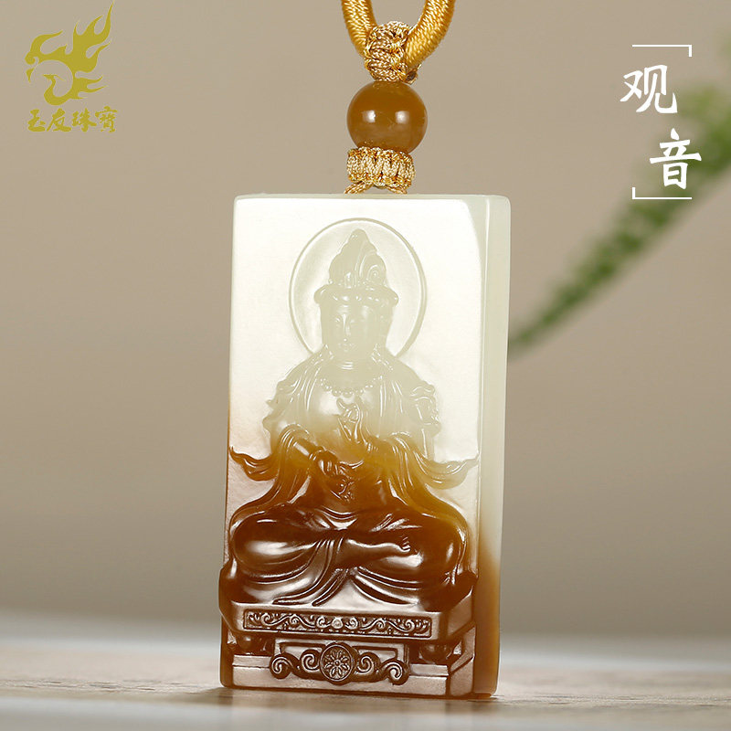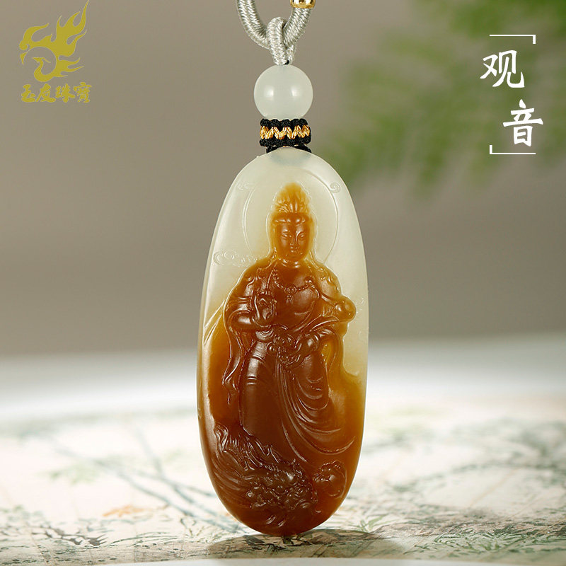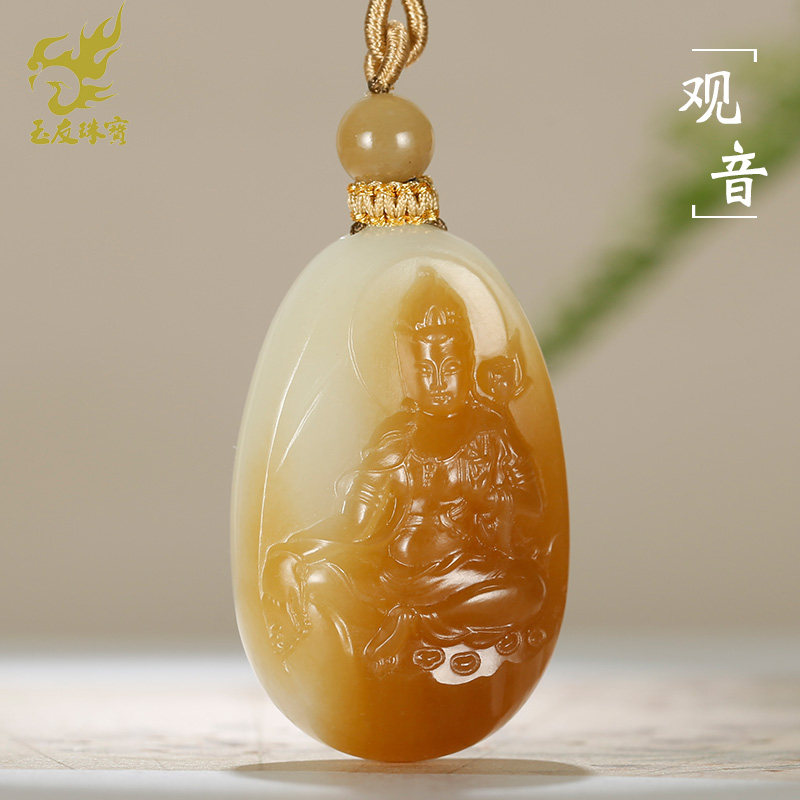 玉友和田玉观音吊坠男款玉坠糖青白玉巧色如意御龙观自在菩萨挂件