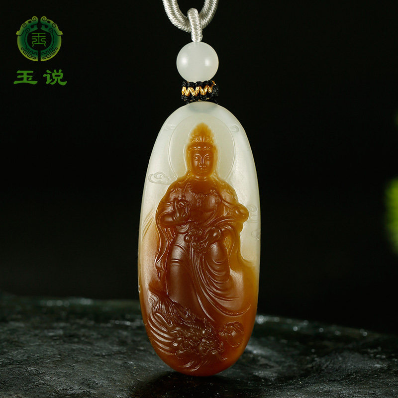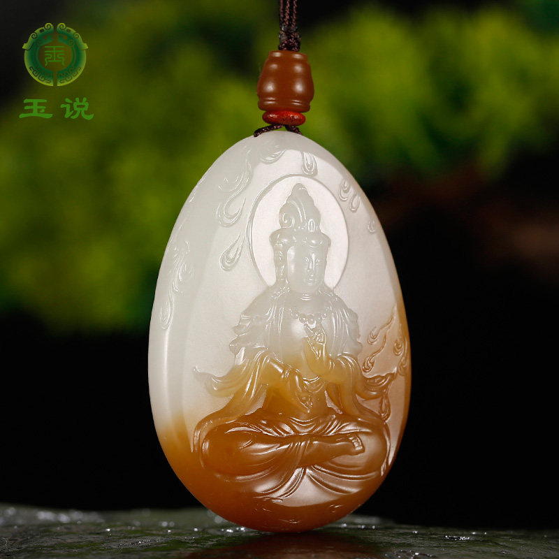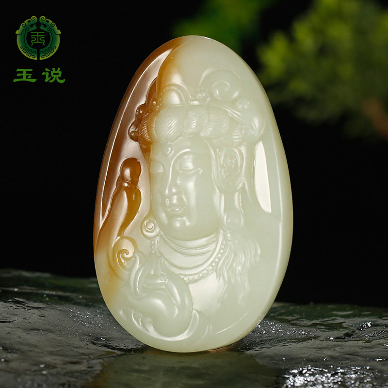 玉说和田玉观音吊坠男款玉坠老红糖青白玉山水荷花观自在菩萨挂件