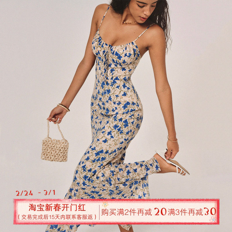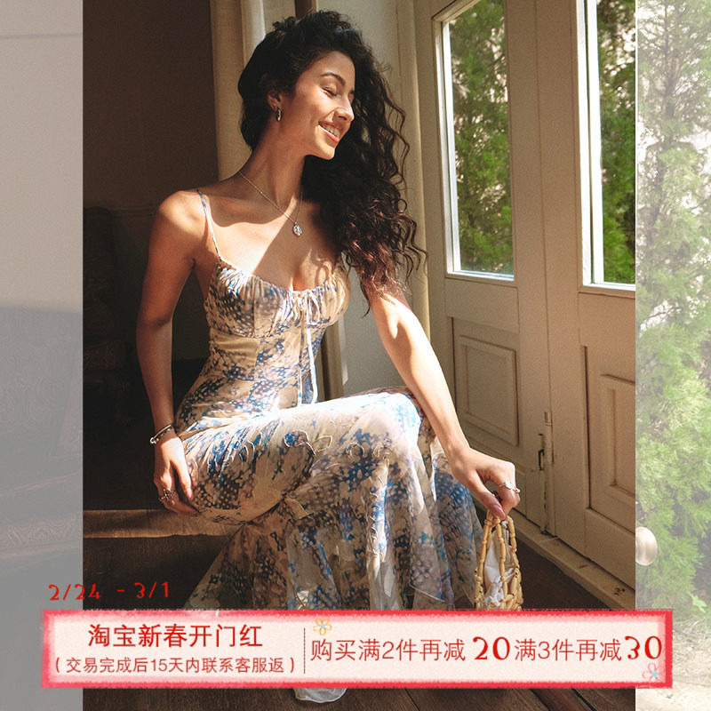 ITSNIKAR法式蓝色蝴蝶碎花连衣裙女夏长款包臀吊带裙海岛度假裙子