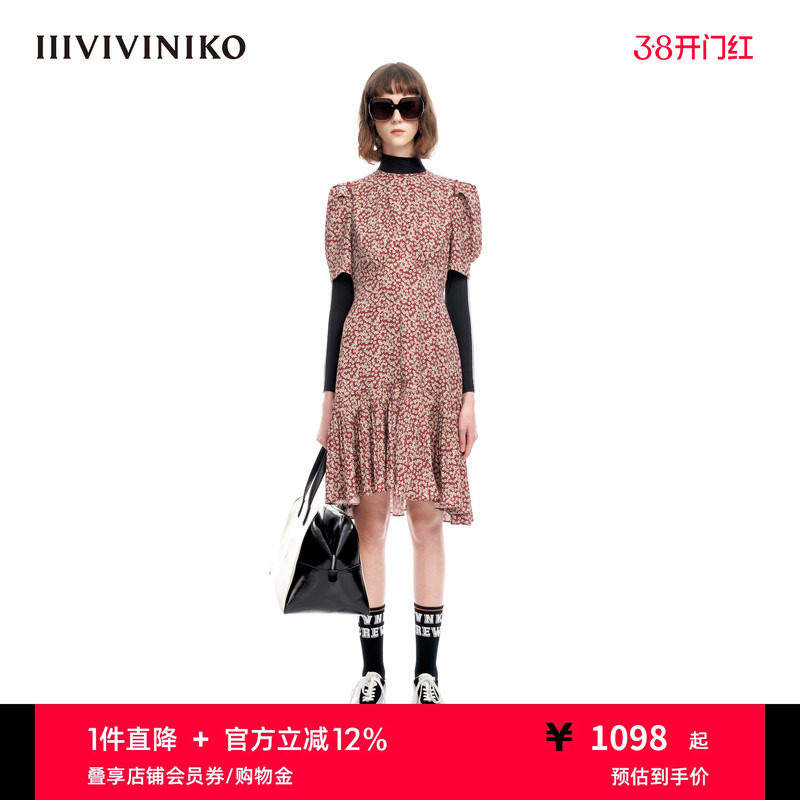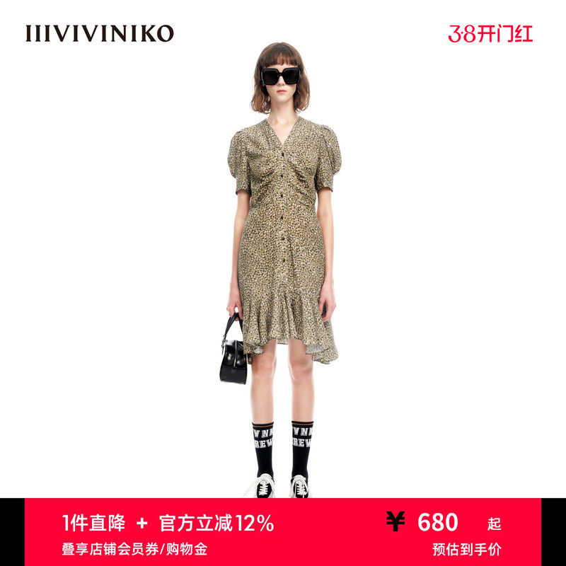 IIIVIVINIKO夏季新品复古飘逸V领修身小碎花连衣裙女M320612138E