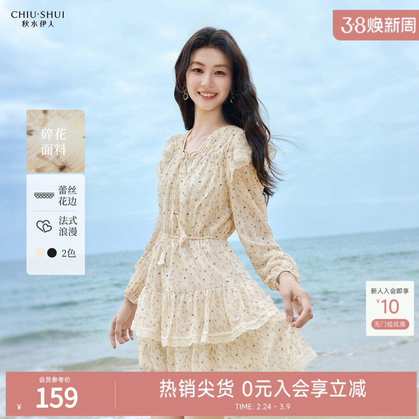 秋水伊人早秋系带V领碎花连衣裙女2025新款秋装木耳边蛋糕裙女