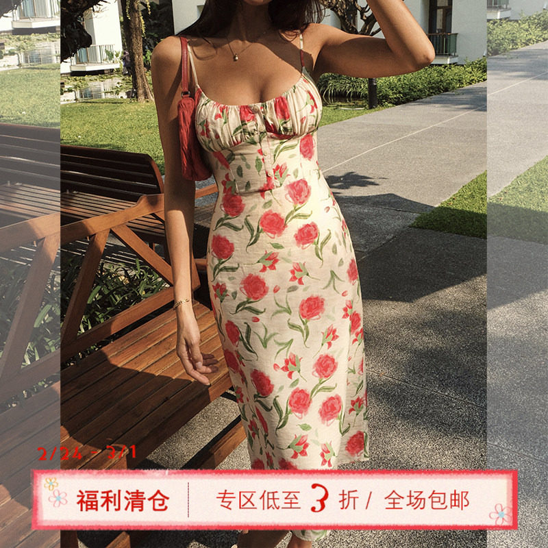 ITSNIKAR法式玫瑰碎花连衣裙女秋复古红色吊带裙海边度假修身裙子