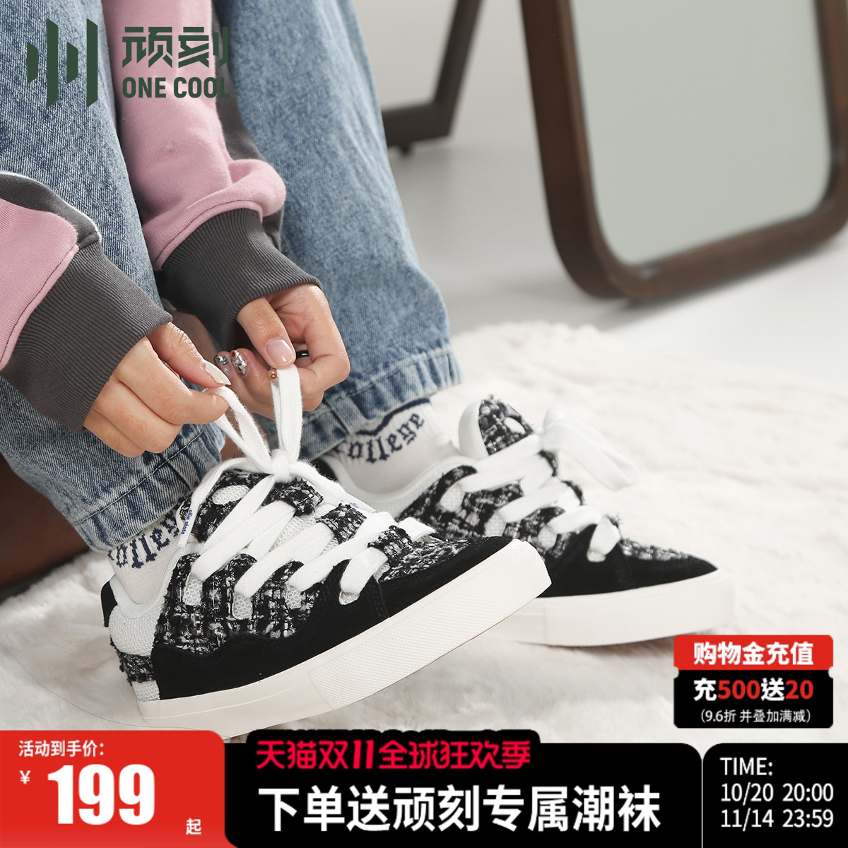 顽刻官方面包鞋黑白小香风翻毛皮帆布拼接秋冬BAKE男女国潮滑板鞋