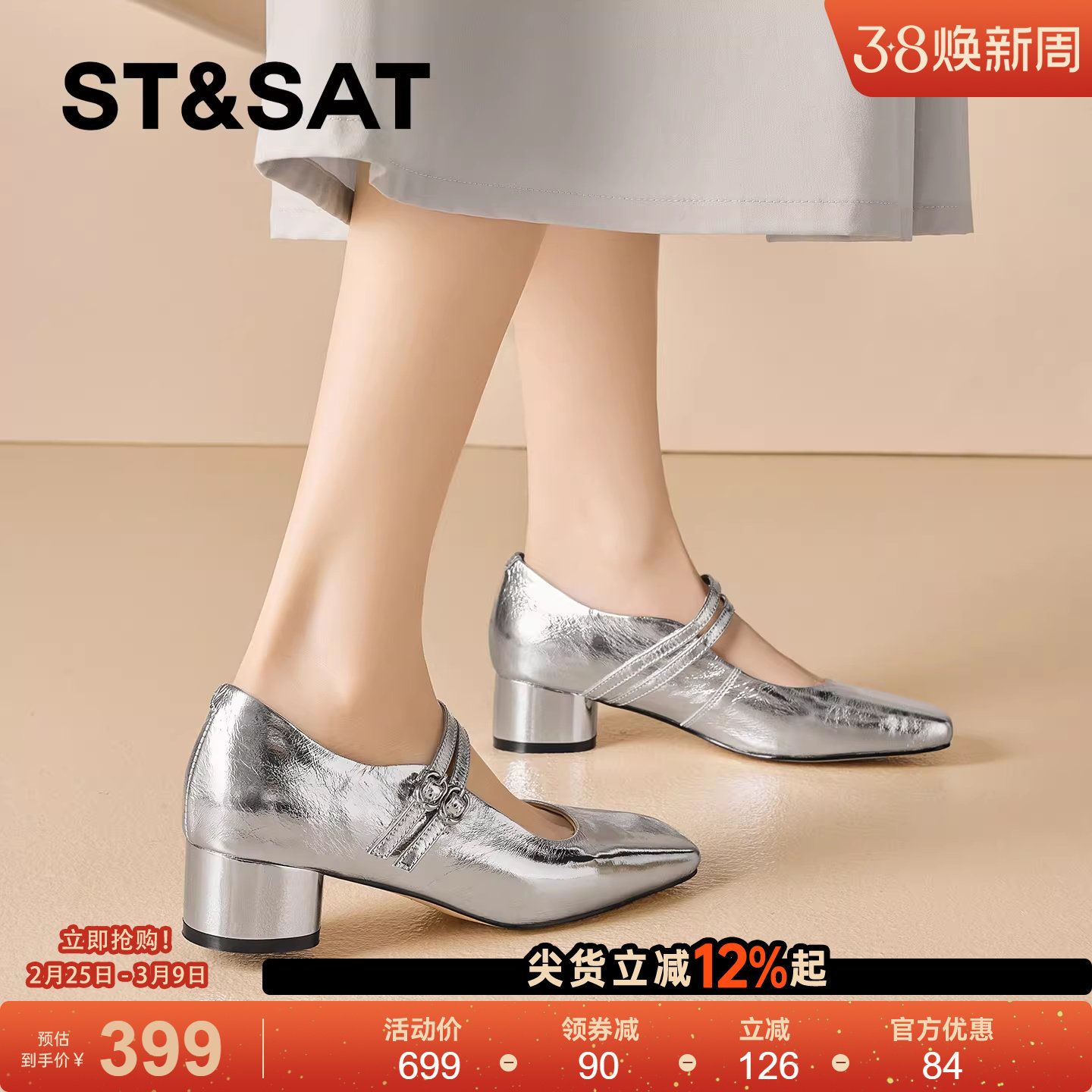 星期六2026春新款粗跟高跟鞋女真皮拼接单鞋一字扣方头防水台女鞋