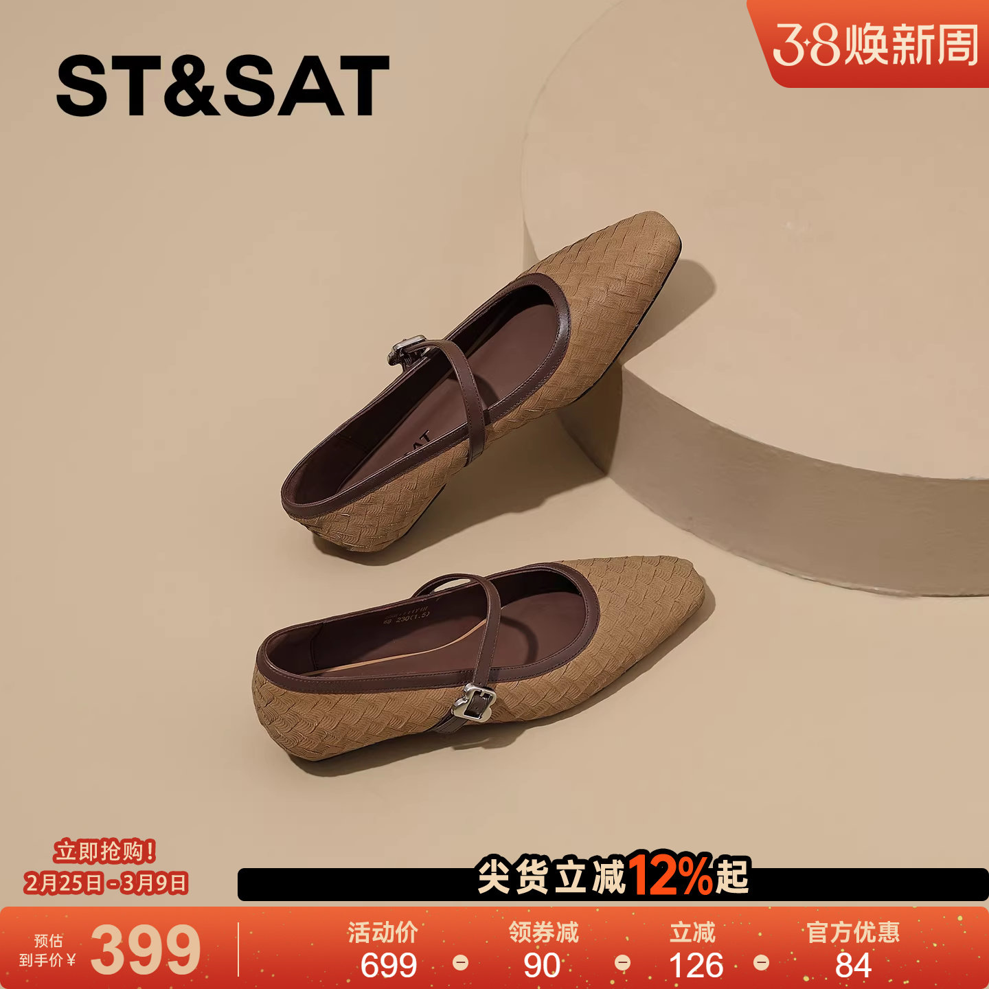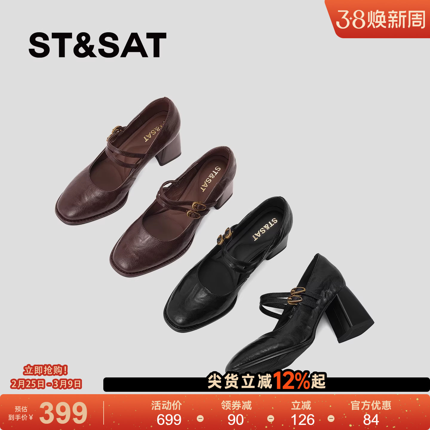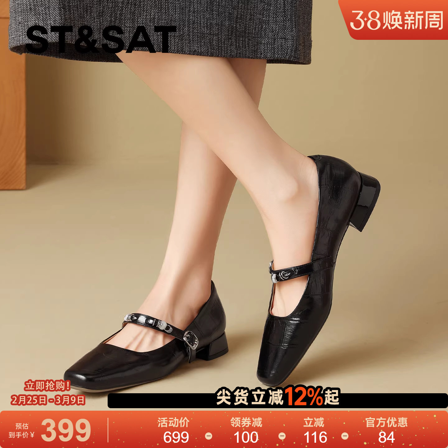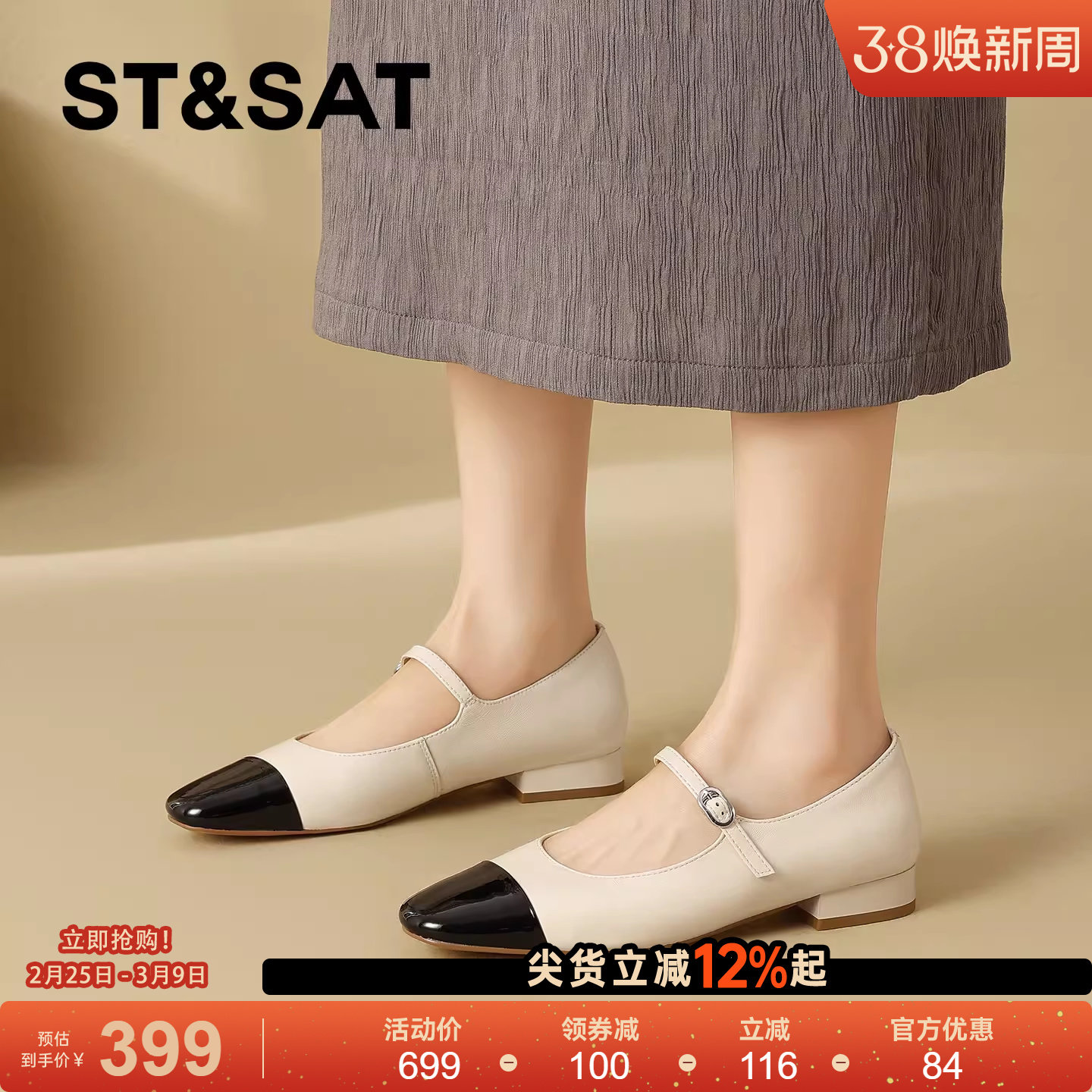 星期六真皮通勤风一字扣浅口单鞋女2026春季新款方头粗跟玛丽珍鞋