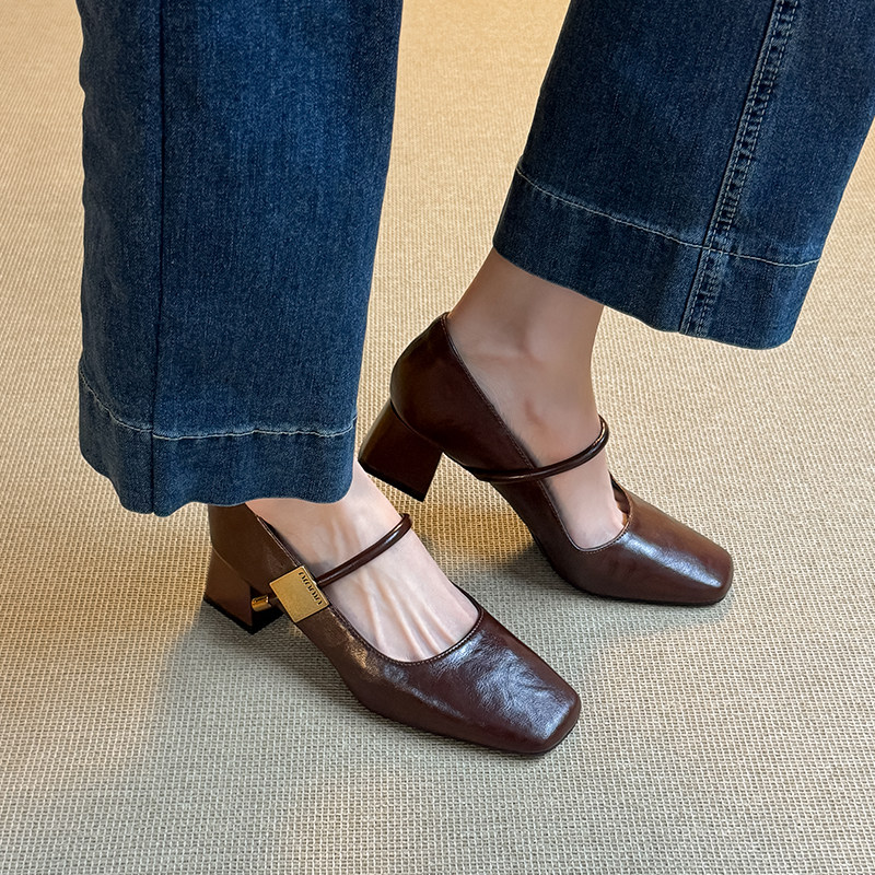 真皮方头粗跟玛丽珍鞋女2026新款法式复古一字扣带软皮中高跟单鞋