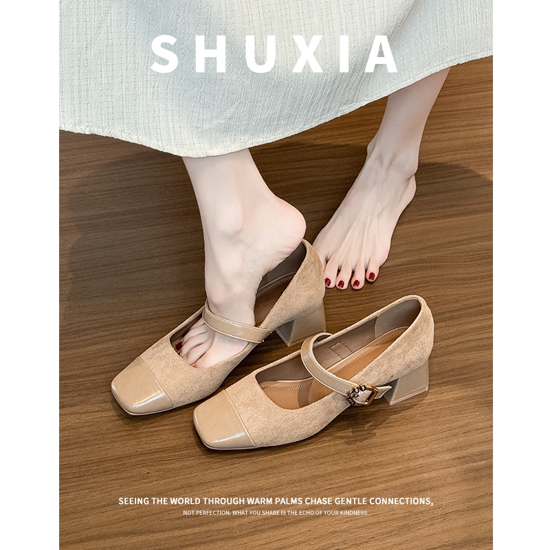 法式方头玛丽珍鞋女2026春秋款真皮绒面拼接一字扣带粗跟气质单鞋
