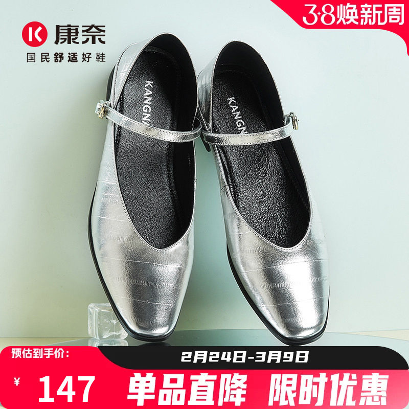星期六真皮一字扣浅口单鞋女2026年春季新款方头粗跟低跟玛丽珍鞋