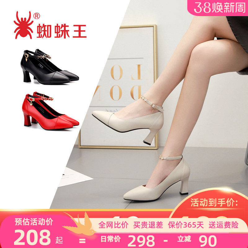 蜘蛛王女鞋高跟鞋女春秋新款一字扣工作鞋真皮百搭粗跟黑色单鞋子