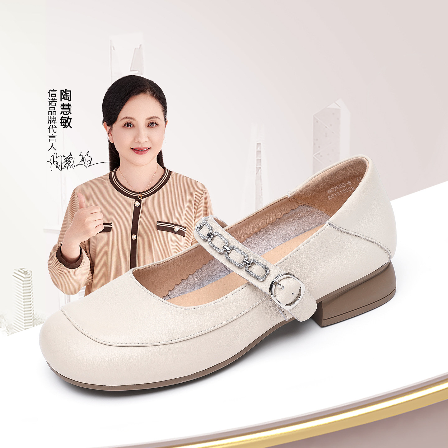 真皮版~爱琴岛米白色方头粗跟一字扣带浅口玛丽珍高跟单鞋女春秋