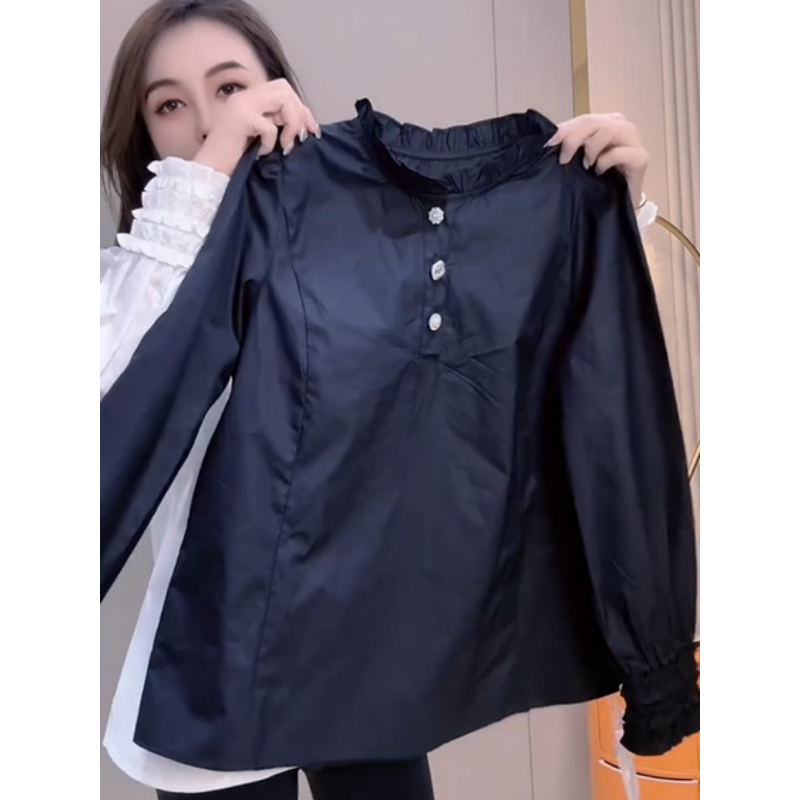 法式气质拼接木耳花边立领衬衫女早春新款宽松百搭层次感别致上衣