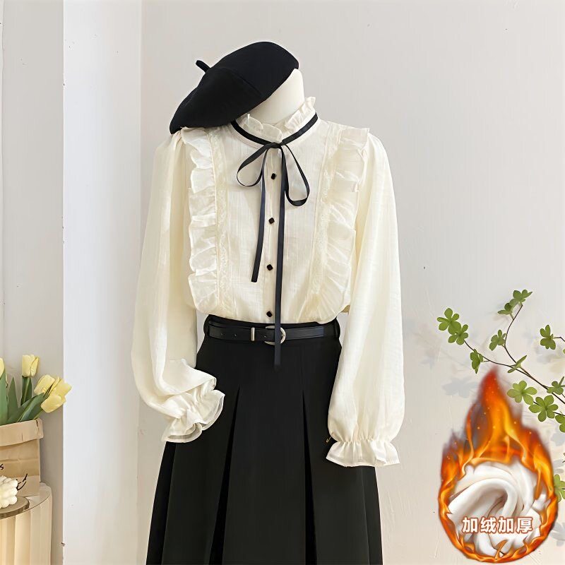 加绒加厚系带木耳花边立领衬衫女秋冬减龄气质内搭打底小衫上衣杏