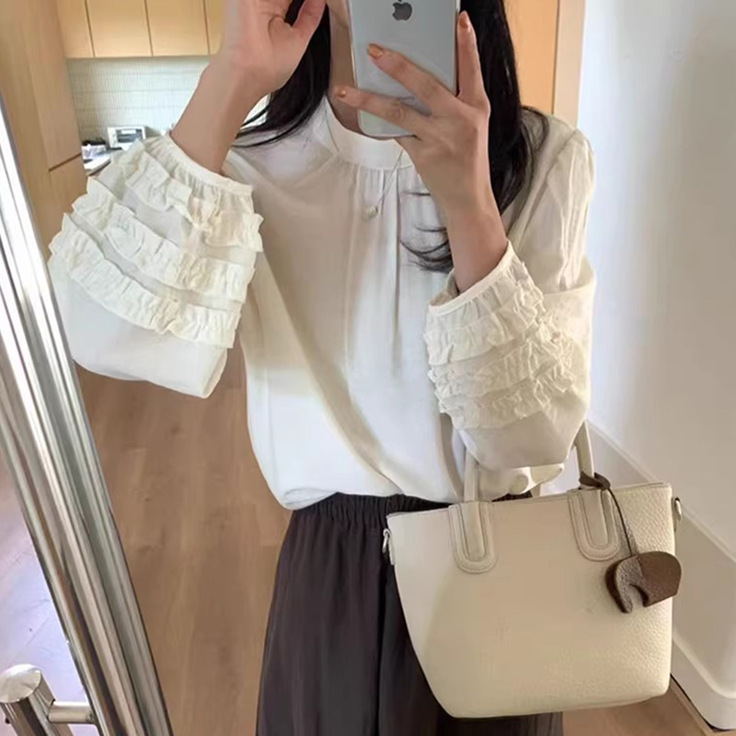 白色花边立领衬衫女秋2024新款设计感拼接荷叶边泡泡长袖气质上衣