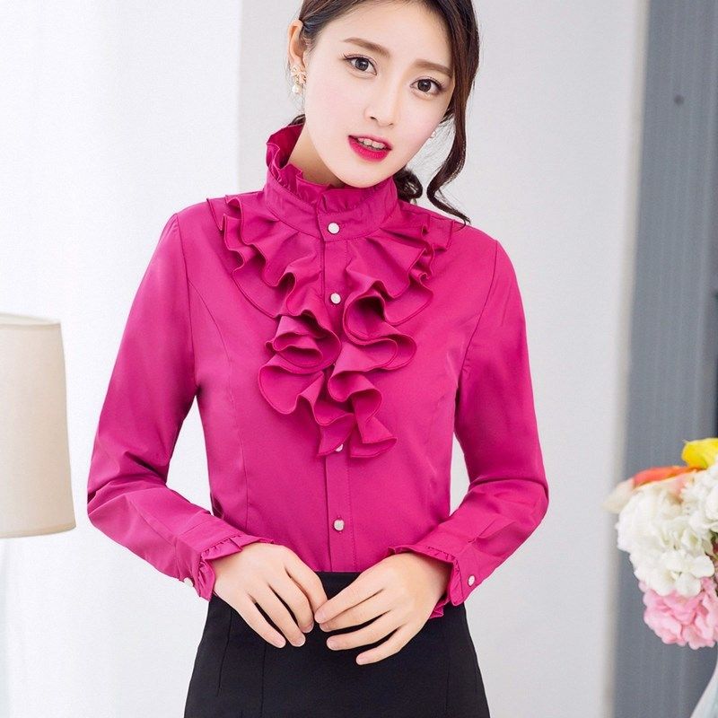 春秋韩范女装荷叶花边立领衬衫女长袖雪纺学生修身打底白衬衣大码