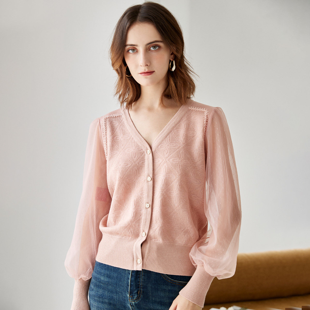百图法式镂空蕾丝花边立领衬衫女长袖春秋新款泡泡袖气质衬衣上衣