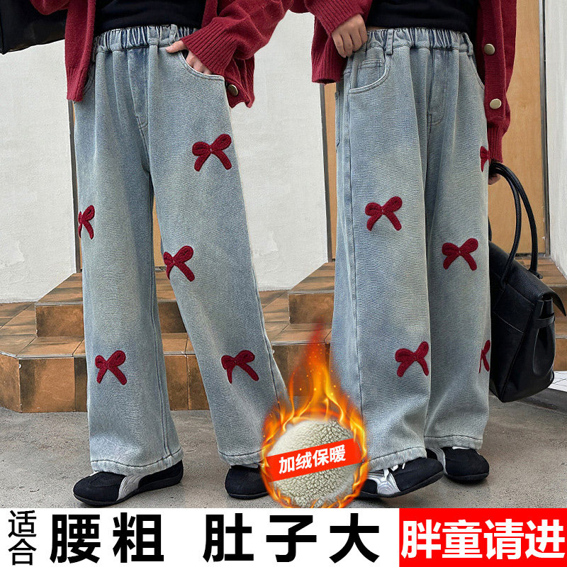 胖女童加绒加厚牛仔裤冬款2025新款中大童加肥加大阔腿裤儿童裤子