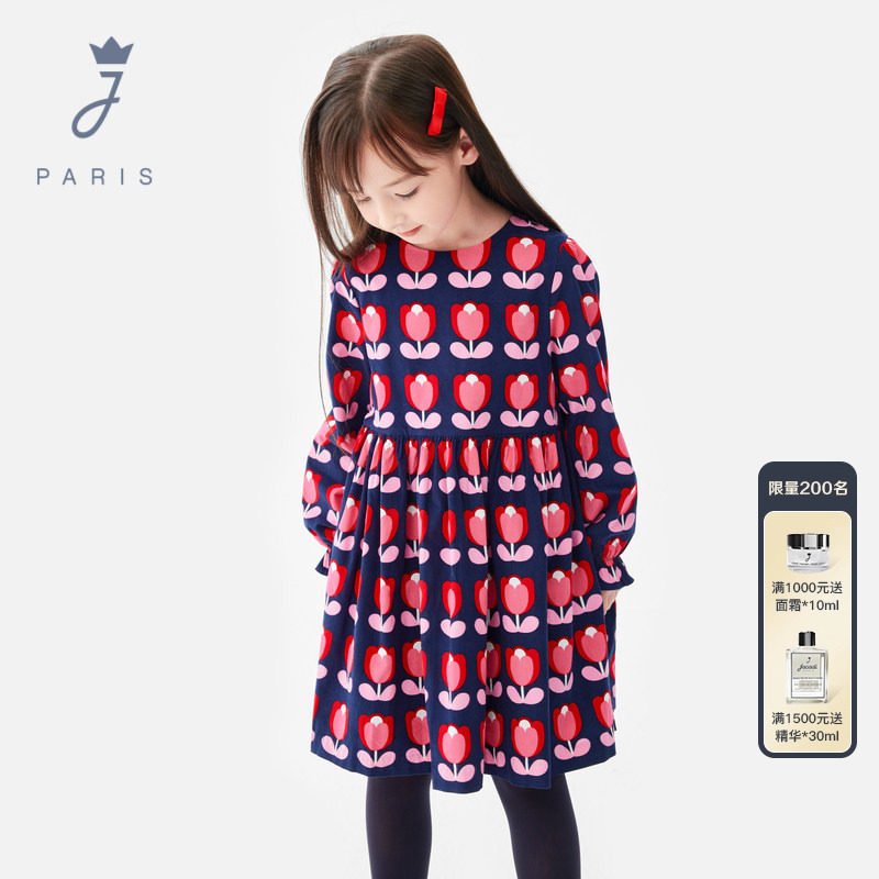 Jacadi亚卡迪法国女大童连衣裙春秋款女童长袖印花裙子2039109