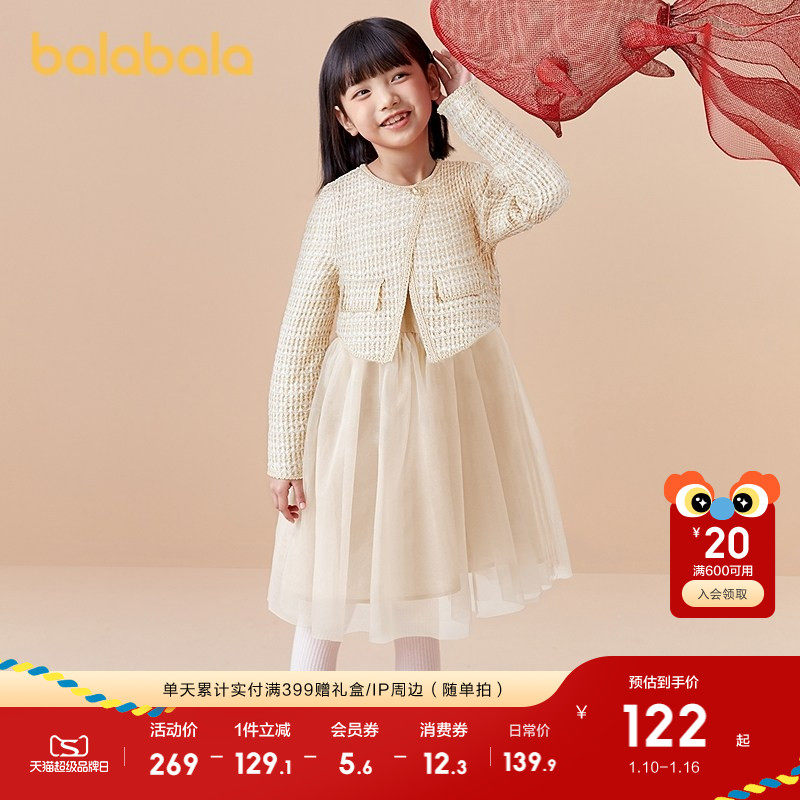 巴拉巴拉女童连衣裙纯棉内里套装大童长裙儿童新年款开衫春装童装