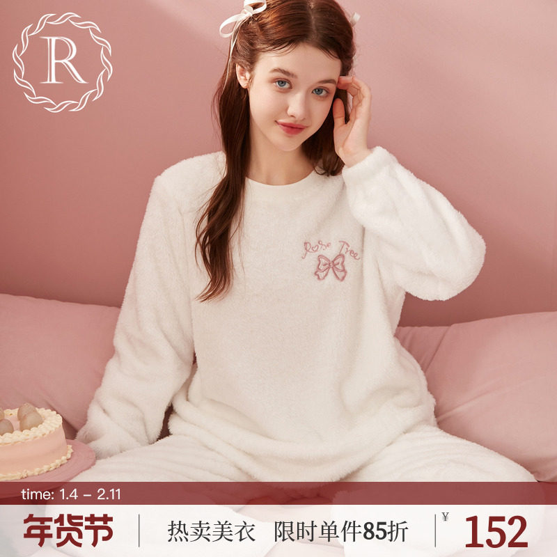 RoseTree珊瑚绒睡衣女冬季法兰绒加厚保暖套头家居服套装2024新款