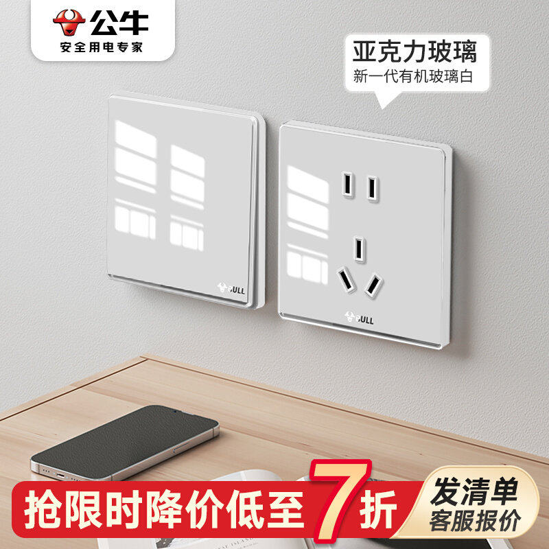 公牛G50白色开关插座玻璃面板家用插座86型镜面16A亚克力开关面板