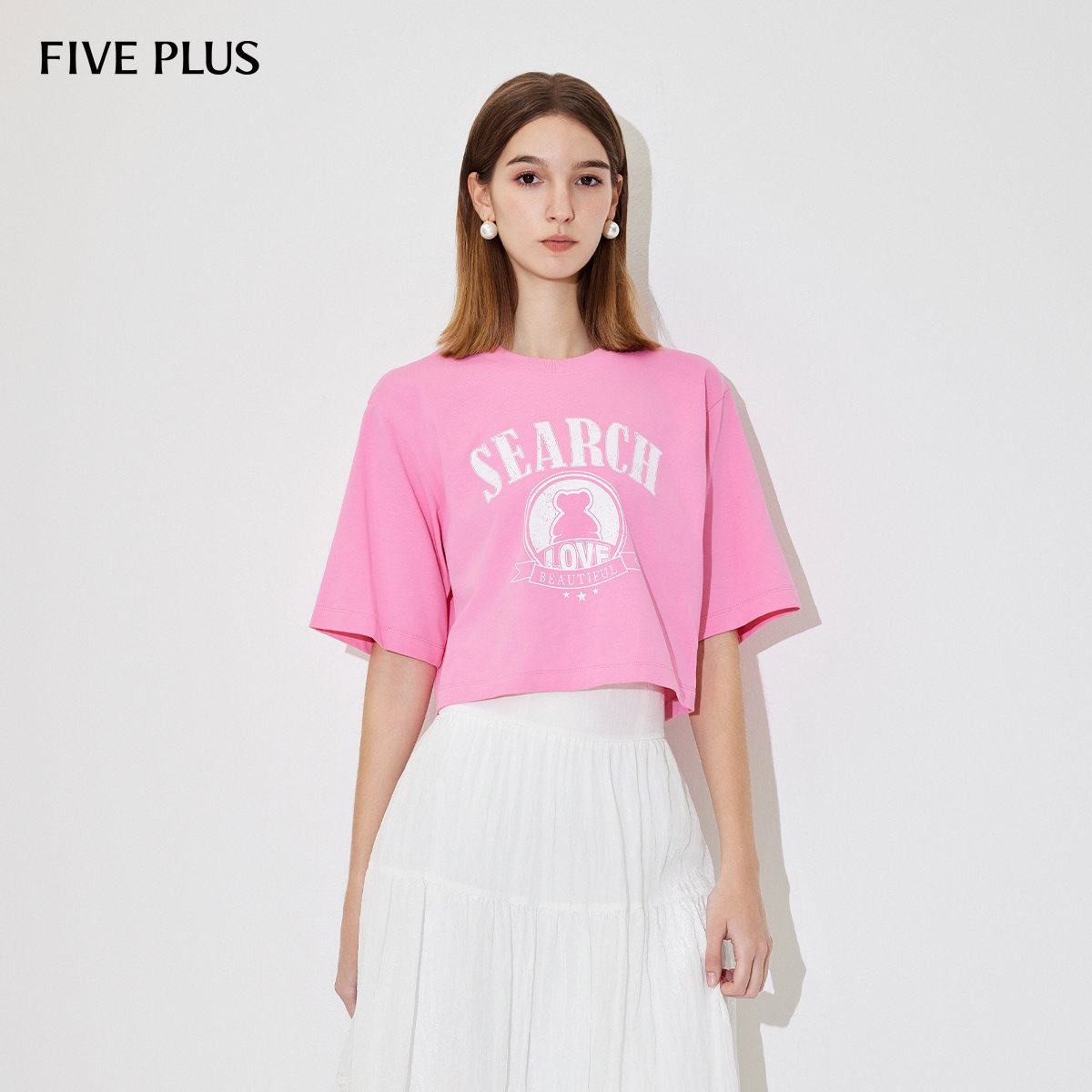 FIVE PLUST恤女上衣宽松短袖纯棉落肩袖字母图案潮新款女夏装