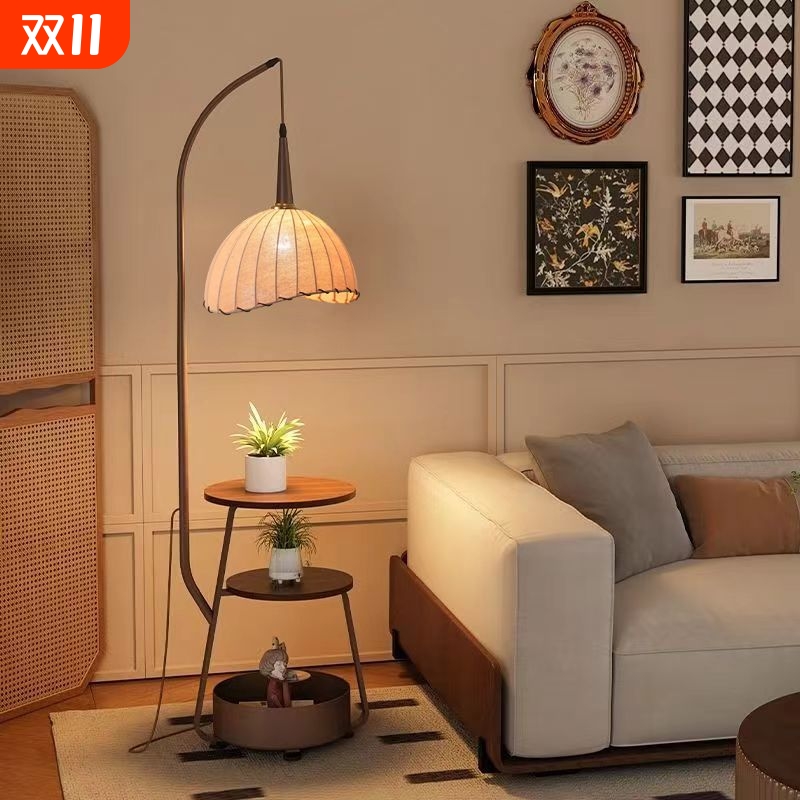 中古风落地灯客厅沙发旁边氛围灯复古卧室床头置物架一体立式台灯