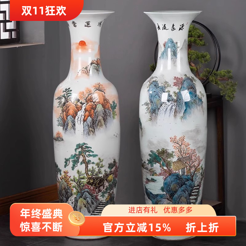 景德镇陶瓷器落地大花瓶手绘粉彩山水开业瓷瓶中式客厅装饰品摆件